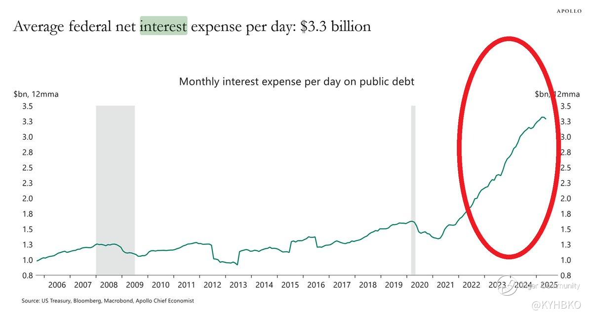 The US government is currently paying a record $3.3 BILLION (daily) in interest on its public debt. The value has DOUBLED over the last 3 years as the federal debt has SKYROCKETED while the Fed raised its interest rates. Unsustainable fiscal path. - X user Global Markets Investor