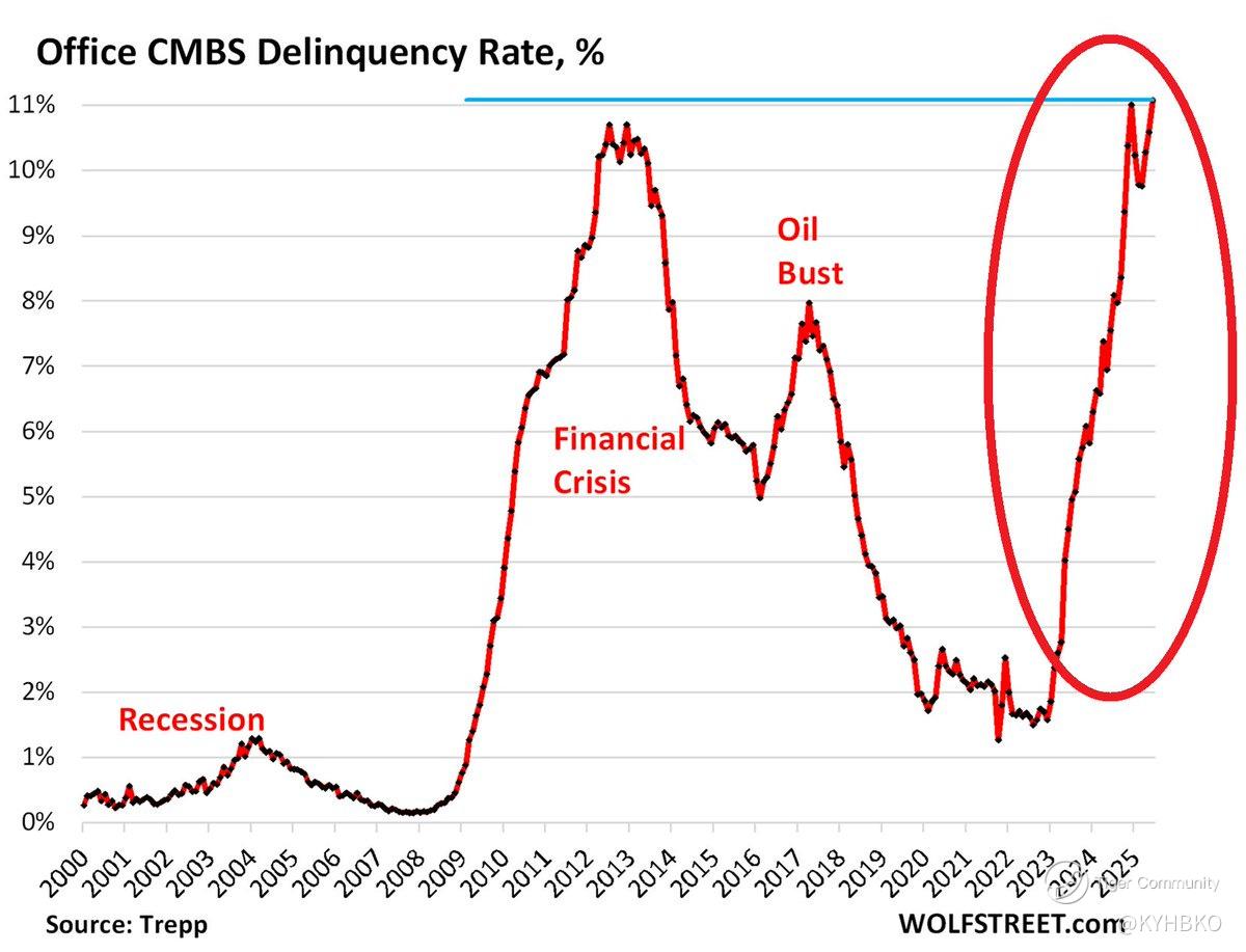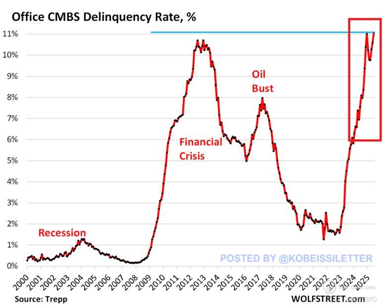 The delinquency rate on Commercial Mortgage-Backed Securities (CMBS) for offices jumped 49 basis points in June, to a record 11.1%. This has now officially surpassed the post-2008 high of 10.7% and the December 2024 peak of 11.0%. Since the start of 2023, the delinquency rate on CMBS for offices has skyrocketed by 9.5 percentage points. Last month, $1.8 billion in CMBS office loans fell into delinquency, while $1 billion in previously delinquent loans were resolved. Meanwhile, the overall US CMBS delinquency rate rose 5 basis points, to 7.13%, the highest in at least 4 years. The office sector is beyond bear market territory. - X user The Kobeissi Letter