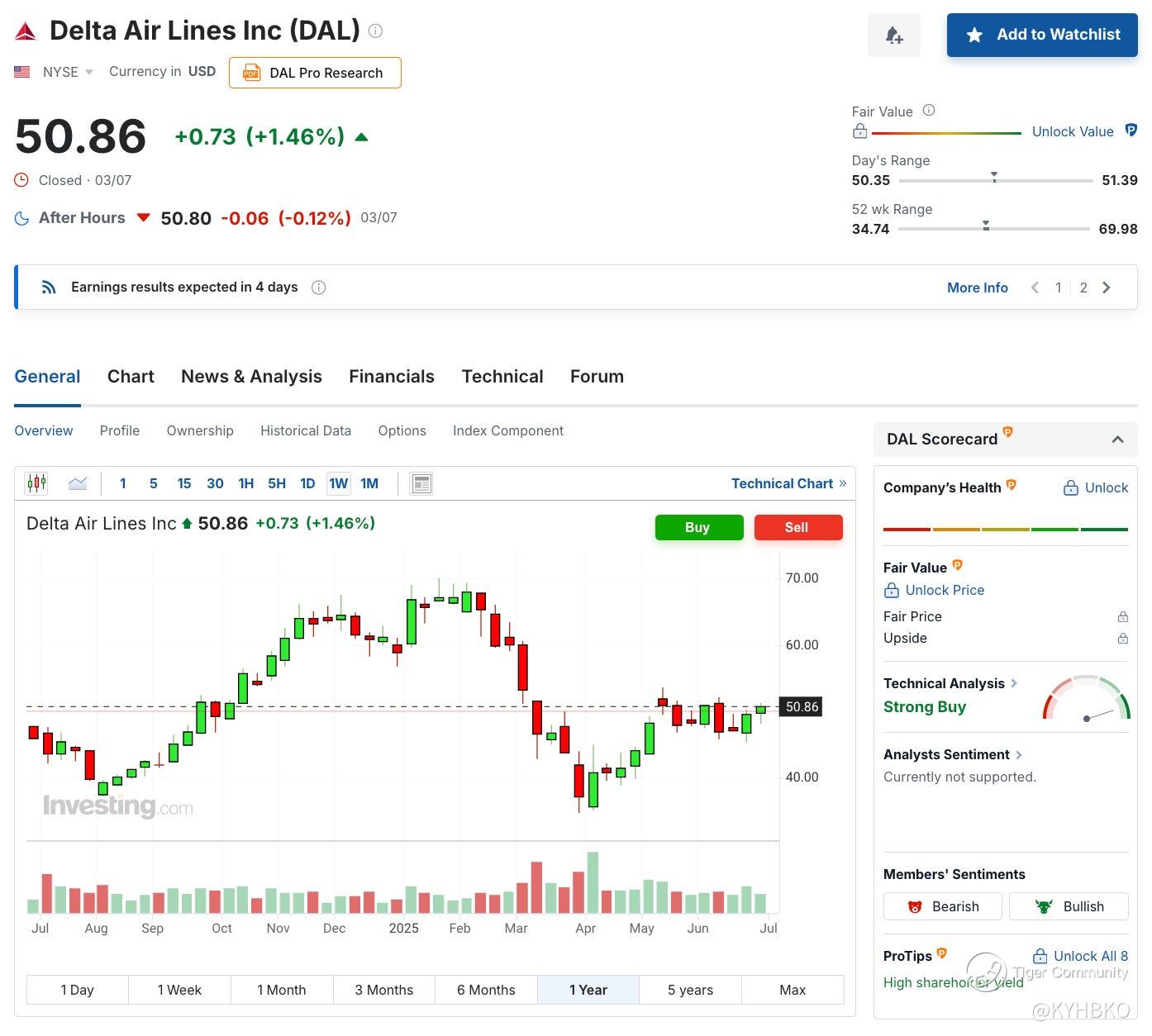 Valuation: The P/E ratio is 9.1, suggesting Delta is undervalued relative to its earnings, aligning with the cyclical nature of the airline industry.