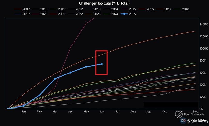US-based employers announced 47,999 job cuts in June, bringing total Q2 2025 layoffs to 247,256, the highest Q2 total since 2020. Year-to-date, firms have announced 744,308 job cuts, the most for any first half of the year since 2020. Outside of 2020, this was the highest first half since 2009, when 896,675 cuts were announced. The government sector has led the surge with 288,628 layoffs, including federal and contractor reductions. Retail and technology sectors followed, with 79,865 and 76,214 job cuts, respectively. Economic conditions, closures, and restructuring have been the primary drivers. US layoffs remain elevated. - X user The Kobeissi Letter