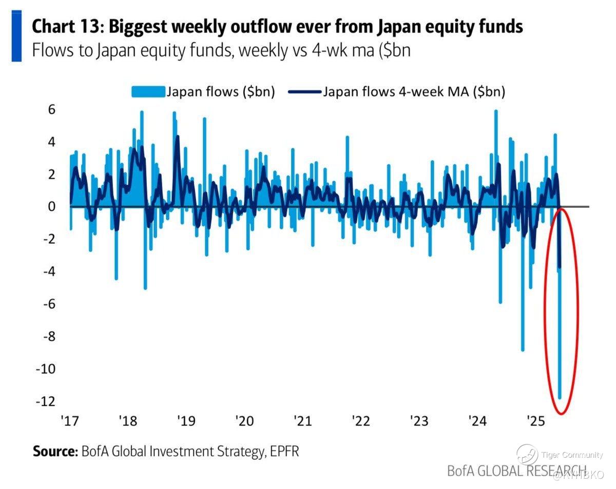 Japan equity funds saw a RECORD $12 billion in net outflows last week. This brought the 4-week moving average of outflows to $4 billion, an all-time high. Have investors been moving money out of equities to Japanese bonds? - X user Global Markets Investor