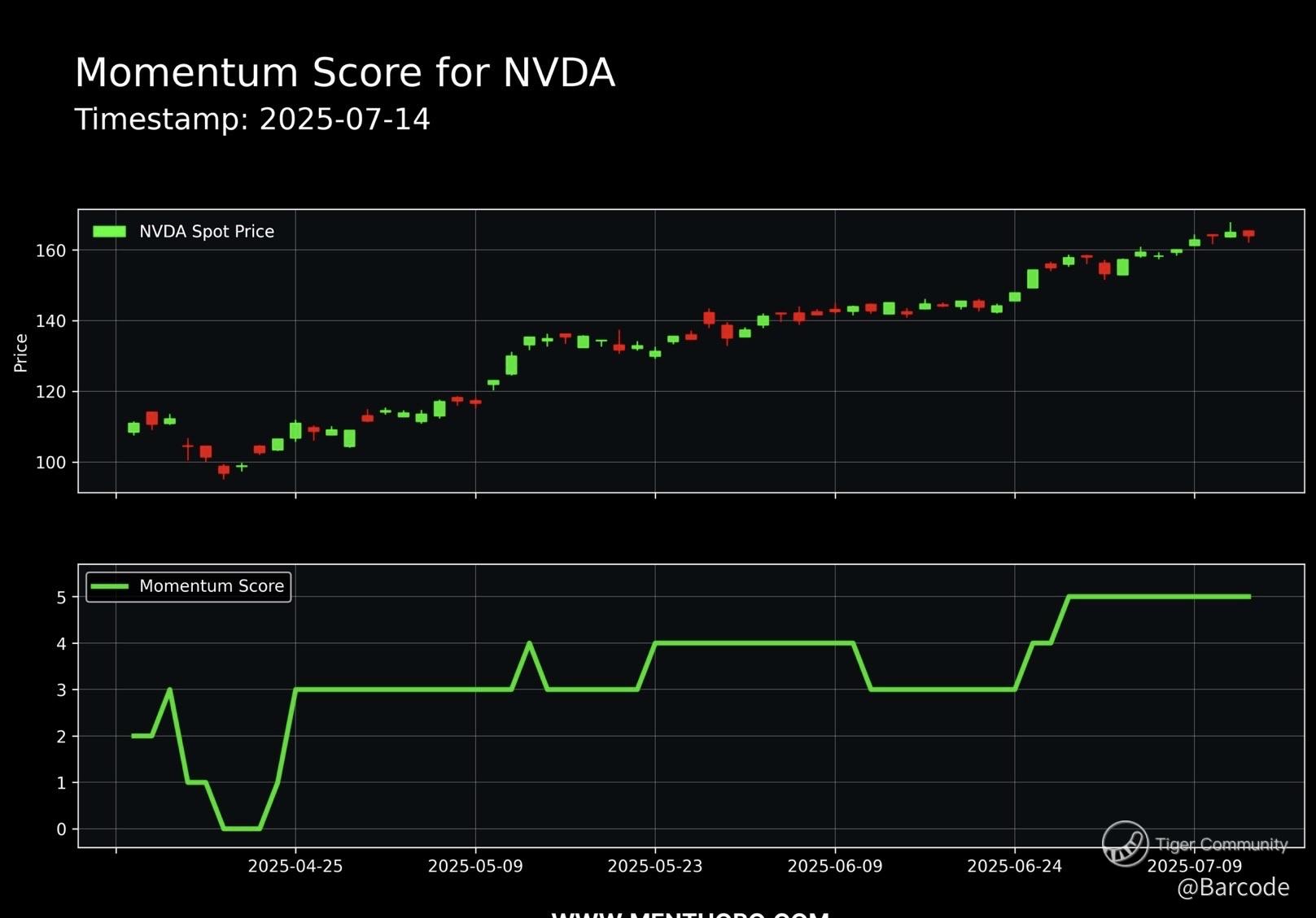 β€’ $NVDA: Momentum Score maxed out at 5, spot price consolidating above $160 with $172.40 the next hurdle. Weekly MACD at 10.60 and RSI (6,12,24) aligned between 72 and 87 across the board.