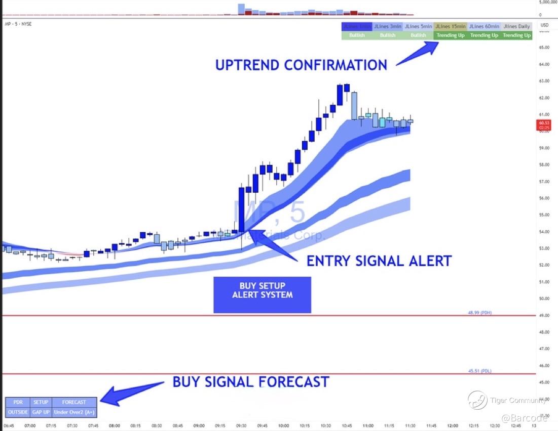 MP is now up 288% year-to-date. Today’s +24.07% surge took it through the $62.87 level on confirmed trend signals. The buy setup was forecasted before the breakout via the JL lines, and confirmed as all timeframes turned bullish in unison. The price respected VWAP on the intraday, pushed through all major MAs on the weekly (MA5: $41.54, MA10: $32.68), and has now achieved trend acceleration, not just continuation.