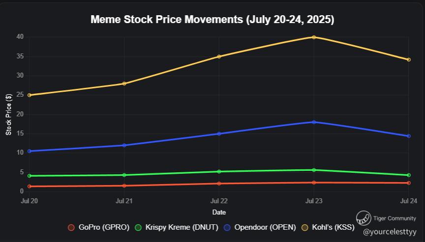 These moves highlight the rapid rotation typical of meme stocks, where new favorites like GoPro and Krispy Kreme replace fading stars like Opendoor and Kohl’s.