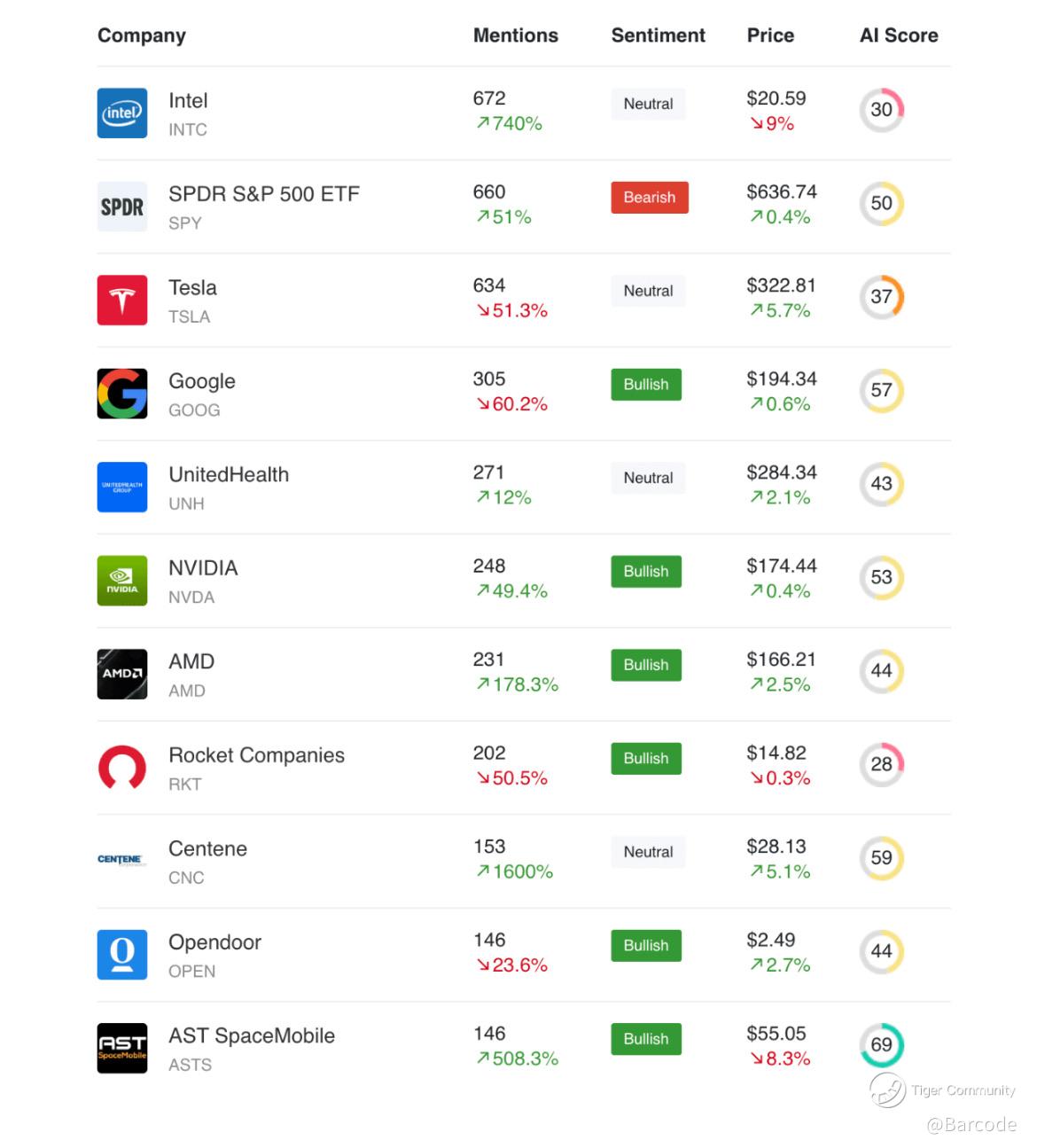 🧠 $INTC (667 mentions, AI Score 8.6%)