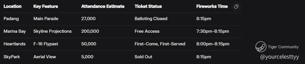 Heartlands: On August 10, five sites—Bishan, Punggol, Yishun, Geylang, and Bukit Gombak—host fireworks and flypasts, with F-16s looping twice. Open fields near MRT stations are prime, though tickets via community centers are first-come, first-served.