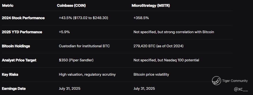 Bitcoin’s meteoric rise past $100,000 in December 2024 has set the stage for a thrilling earnings season for crypto-related stocks like Coinbase Global ( $Coinbase Global, Inc.(COIN)$ ) and MicroStrategy ( $Strategy(MSTR)$ ). With both companies reporting Q2 2025 earnings on July 31, 2025, investors are eager to see if Bitcoin’s rebound will propel these stocks to new heights or if risks like high valuations and regulatory uncertainty could trigger a pullback. This report dives into the dynamics driving Coinbase and MicroStrategy, their potential for continued outperformance, and the weight of MicroStrategy’s Bitcoin holdings on its valuation.