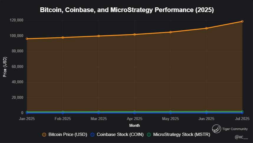 Bitcoin’s price has been a key driver for crypto-related stocks in 2025. After breaking the $100,000 barrier in December 2024, Bitcoin reached $119,000 by July 2025, fueled by spot price ETF approvals, the halving of mining rewards, and stabilizing interest rates. This bullish momentum has lifted stocks like Coinbase and MicroStrategy, which are closely tied to the cryptocurrency’s performance. The chart above illustrates the parallel trends in Bitcoin, Coinbase, and MicroStrategy stock prices throughout 2025, highlighting their correlation.