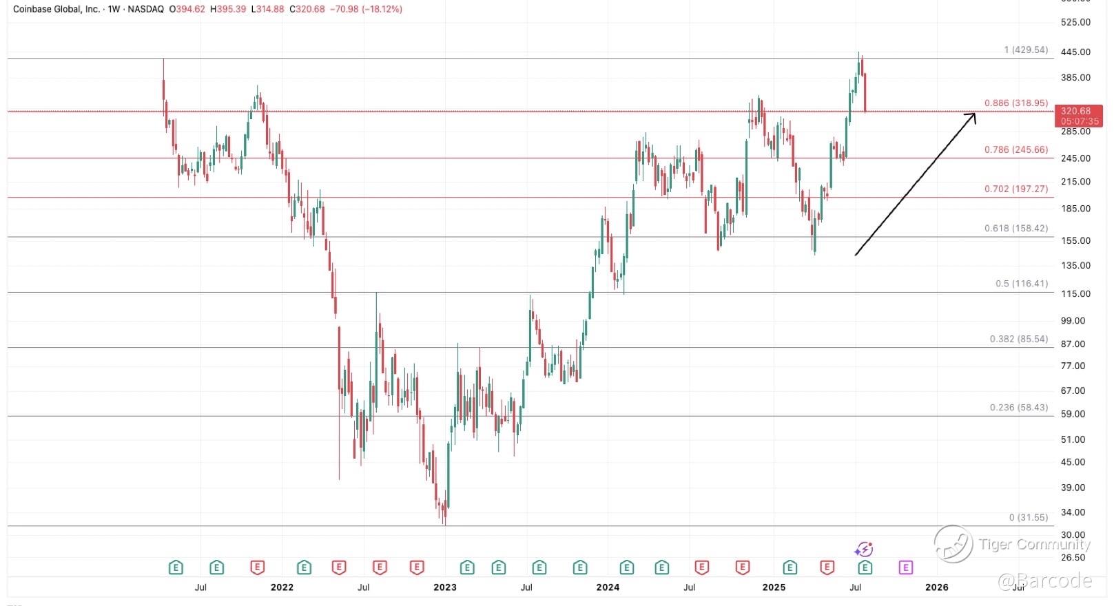 I’m watching the charts even closer than the headlines. On the weekly view, $COIN tagged the .886 fib at $318.95; known in crypto circles as the last retracement before explosive reversal. We’re hovering right on top of the 0.5–0.618 golden pocket ($293.61–$257.97) and sitting squarely on the high-volume node at $310.61. RSI has pulled back from an extreme 98.6, cooling the overbought conditions that stretched price to $444.65 two weeks ago.