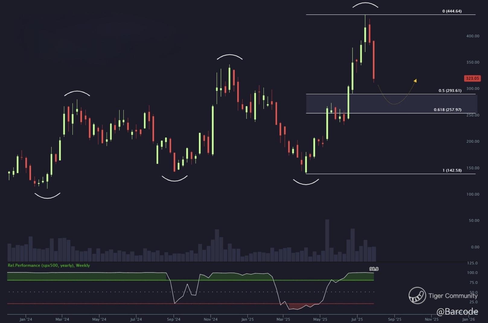Technically, we are not in a breakdown. This is a backtest. The inverse head-and-shoulders remains intact, with weekly candles still inside the prior uptrend channel. The bullish continuation setup is alive, and if $295 holds, I believe this becomes a launchpad toward $353, then $444.65, with the Fibonacci extension reaching $476.93 still valid.