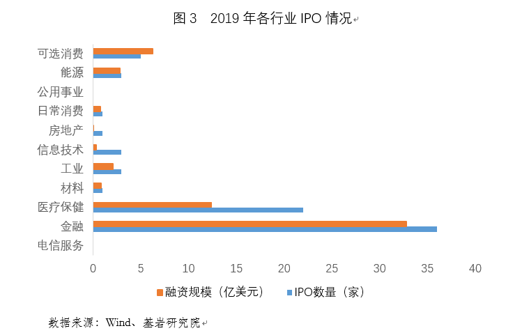 在2019年一季度上市的全部企業中,金融行業和醫療保健行業最爲活躍,IPO公司數量分別達到36家、22家。這兩個行業佔據了全季度IPO公司總數的77.33%。按融資規模來看,金融行業一季度IPO融資規模達32.77億美元,該行業公司平均IPO融資0.91億美元;醫療保健行業一季度IPO融資規模爲9.82億美元,該行業公司平均IPO融資0.49億美元。