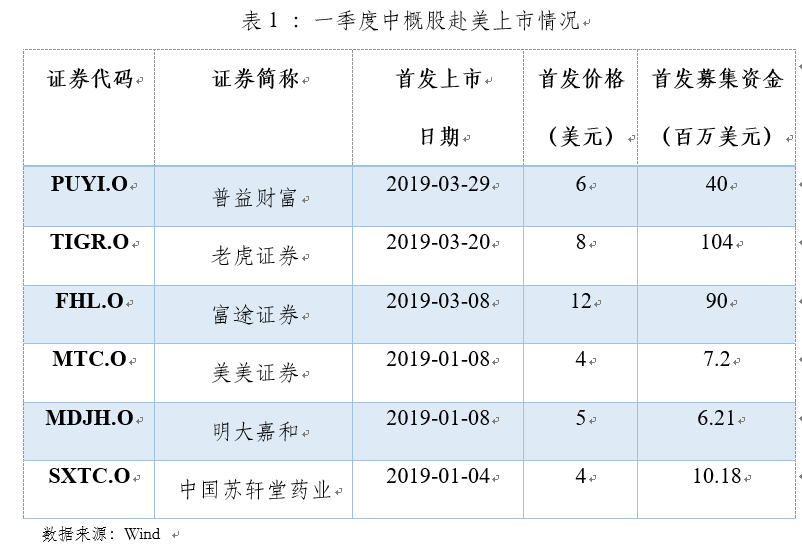 近年來,由於美國市場更爲自由、規範和成熟等特點,備受中國企業的喜愛,很多中國企業都選擇了赴美上市。2019年一季度美國上市IPO的中概股共有6家,分別是美美證券、中國蘇軒堂藥業、明大嘉和、老虎證券、富途證券和普益財富。