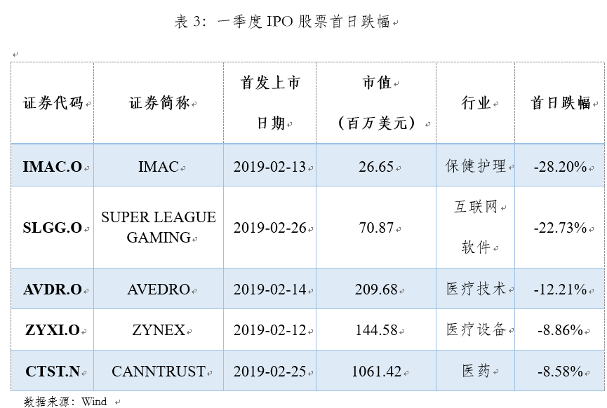 2019年一季度IPO首日跌幅最大的五家公司按順序分別是:IMAC、Super League Gaming、Avedro、Zynex和Canntrust。其中IMAC以-28.2%的首日跌幅位列跌幅排行榜首位。