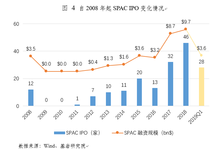 較之整體美國IPO市場的降溫,空白支票類公司(SPAC)上市熱情不減。2019年一季度SPAC IPO規模再創新高,單季度IPO數量達28家(募資總計36.3億美元),佔金融類公司的77.78%,佔全體IPO公司的37.33%。相比之下,2018年全年新上市的SPAC公司有46家,佔美國資本市場IPO數量的19%。