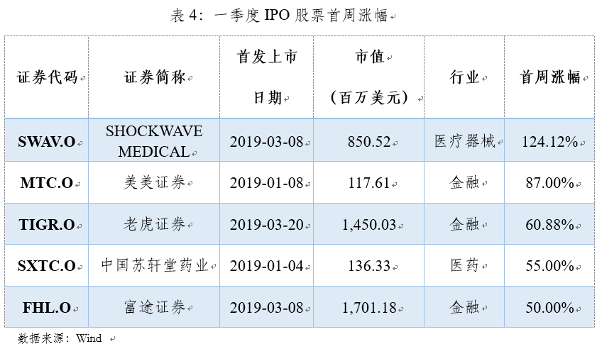 2019年一季度IPO首日漲幅最大的五家公司按順序分別是:Shockwave Medical、Hoth Therapeutics、美美證券、中國蘇軒堂藥業和老虎證券。其中Shockwave以79.41%的首日漲幅位列第一。值得一提的是,在首日漲幅榜前五的公司中,中概股佔據了三席,分別漲幅48.5%、43.5%和36.5%。