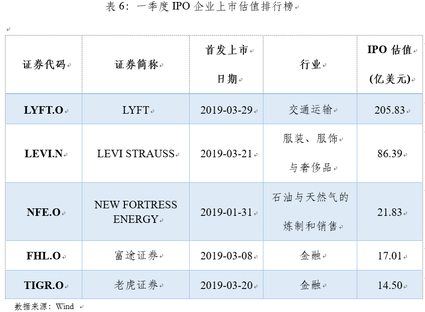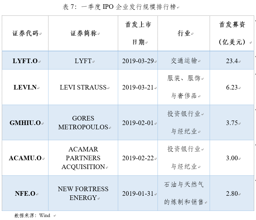 從IPO資金募集的角度來看,2019年一季度募集金額最大的五家公司均爲美國公司,排名第一的仍然是“網約車”巨頭LYFT, IPO共計募集資金餘約23.4億美元。排名二到五的分別爲Levi Strauss、Gores Metropoulos、Acamar Partners Acquisition和New Fortress Energy