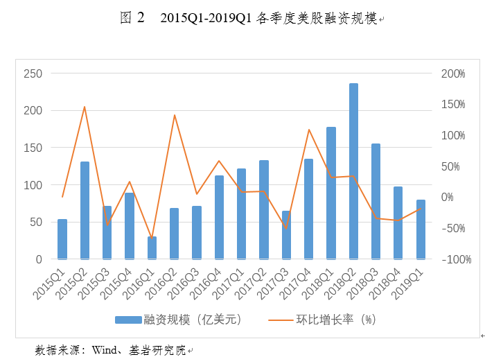 受2019年年初美國政府停擺的影響,2019年一季度美股上市IPO公司數量明顯放緩。截至2019年3月31日,一季度全美上市IPO公司(不含OTC)總計75家,環比下降15.73%,同比下降19.35%。