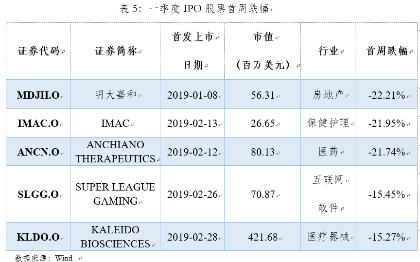 2019年一季度IPO首周跌幅前五的公司按順序分別是:明大嘉和、IMAC、Anchiano Therapeutics、Super League Gaming和Kaleido Biosciences。其中,明大嘉和以-22.21%的跌幅位於首周跌幅榜榜首。