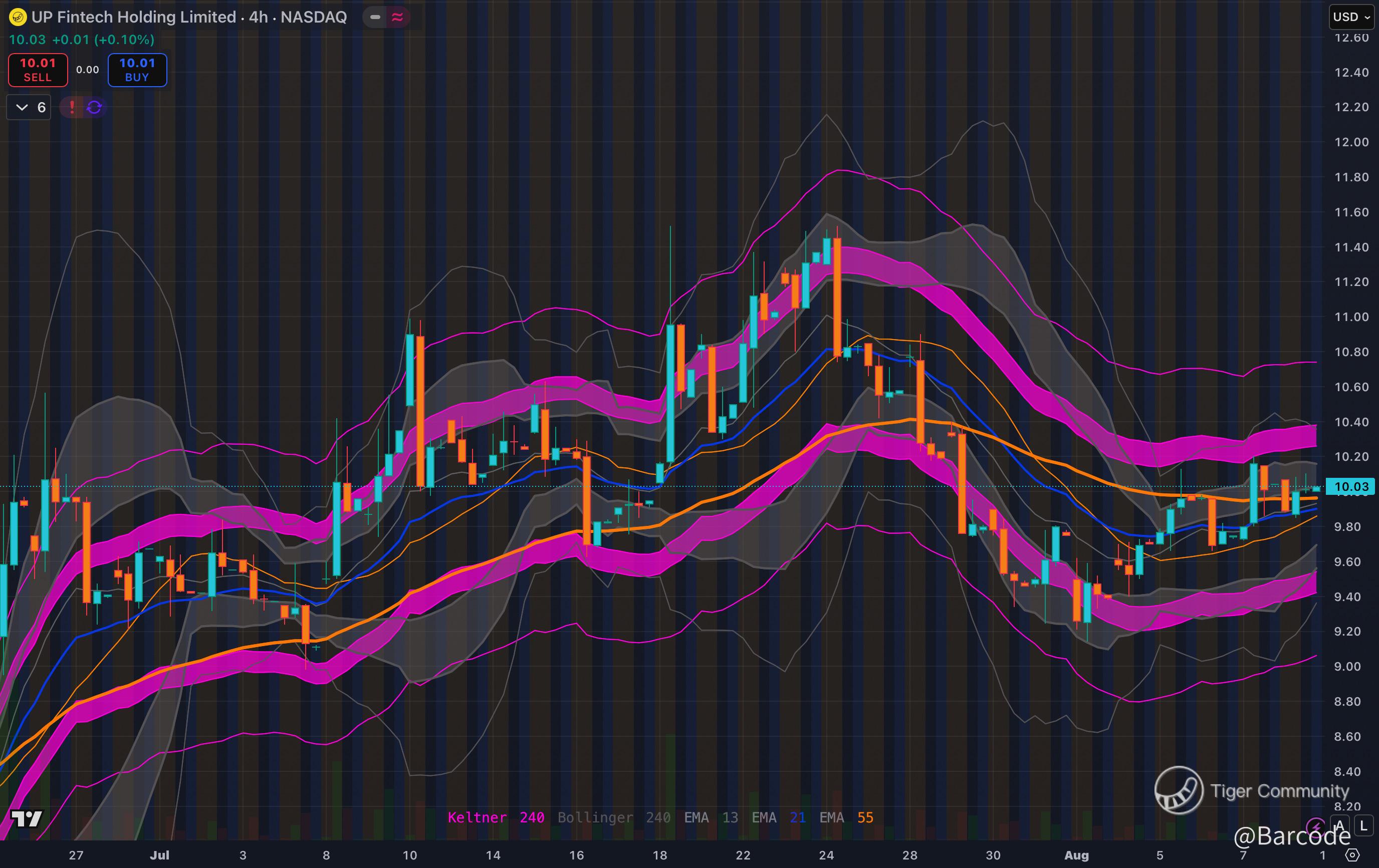 On the 4H chart: $TIGR is consolidating at $10.03 within its Keltner and Bollinger mid-bands. EMA-13 has crossed above EMA-21, and EMA-55 is acting as pivot support. RSI sits at 56.4 on the 4H, 59.8 on the daily, and 62.1 on the weekly; a healthy zone that supports further upside without signalling overbought conditions. MACD on both 4H and daily is trending positively, with histogram expansion.