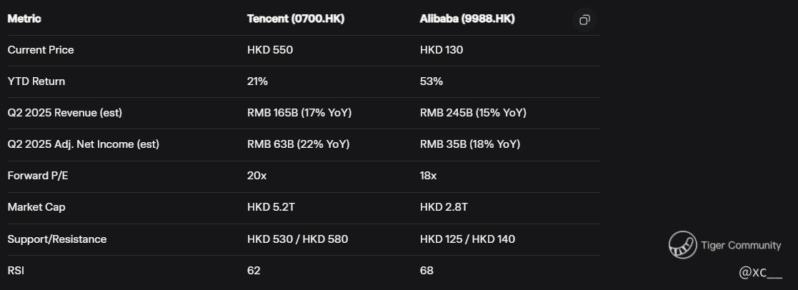 $Alibaba(BABA)$ $TENCENT(00700)$ The week of August 11-15, 2025, brings a critical spotlight to China’s tech giants as Tencent Holdings and Alibaba Group unveil their interim reports, shaping the Hang Seng Index and global investor sentiment. With Tencent reporting on Wednesday, August 13, and Alibaba on Friday, August 15, expectations are high amid a 14% Hang Seng Tech Index rally and tariff uncertainties (30% on EU/Mexico, 35% on Canada). The S&P 500 at 6,297.36 and Nasdaq at 20,884.27 reflect a bullish U.S. market, but China’s tech sector faces unique pressures from AI investments and domestic consumption shifts. Unpack the forecasts, key catalysts, and trading strategies to navigate this high-stakes earnings season.