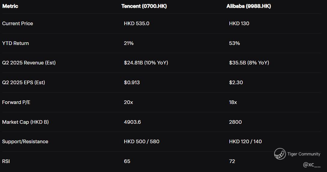 $Alibaba(BABA)$ $TENCENT(00700)$ The spotlight shines on China’s tech giants as Tencent Holdings (0700.HK) and Alibaba Group (9988.HK) prepare to unveil their interim reports this week, with Tencent reporting on Wednesday, August 13, 2025, and Alibaba on Friday, August 15, 2025. These heavyweights of the Hang Seng Index, which has climbed 2.3% recently, are poised to influence a potential $44 billion rally in China’s tech sector. With the S&P 500 at 6,297.36 and Nasdaq at 20,884.27 reflecting global bullishness, yet tariffs (30% on EU/Mexico, 35% on Canada) and geopolitical tensions (Israel-Iran conflict, oil at $75/barrel) adding uncertainty, the stakes are high. Can Tencent and Alibaba’s earnings deliver the growth to fuel further gains, or will challenges dim the outlook? This analysis dives into the earnings expectations, market dynamics, and trading strategies to seize the moment.