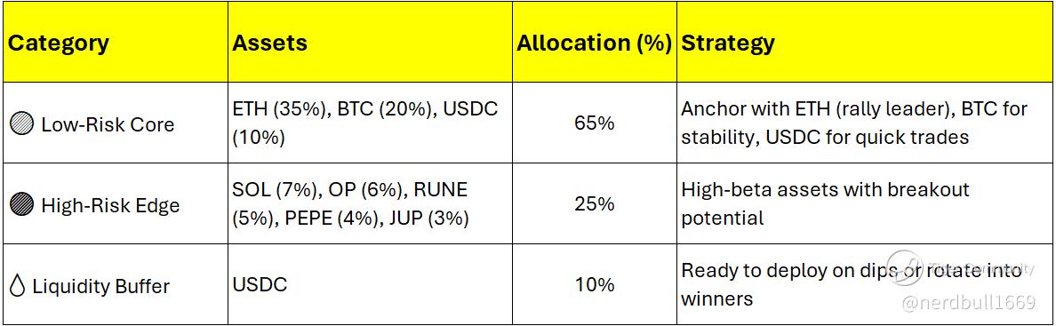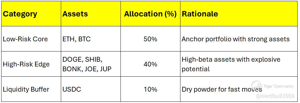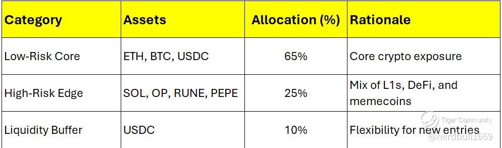 Notes: Includes Solana and Optimism for Layer 1/2 exposure, plus a small memecoin allocation for speculative upside.