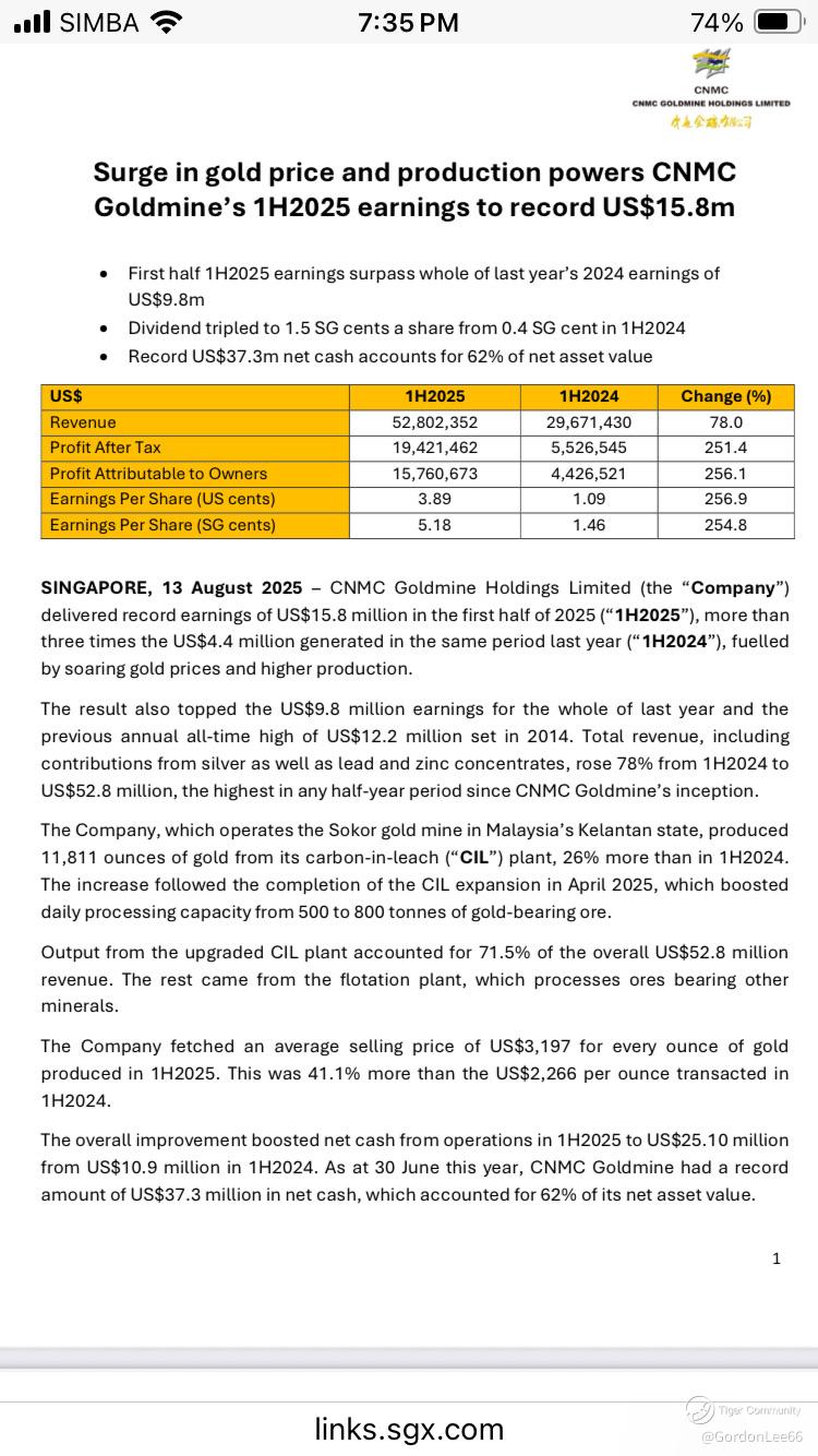 $CNMC Goldmine(5TP.SI)$ Profit for first half of 2025 is more than the whole of last year 2024. Dividend of 1.5 cents, ex date 29 Aug, pay on 12 Sep 😁.