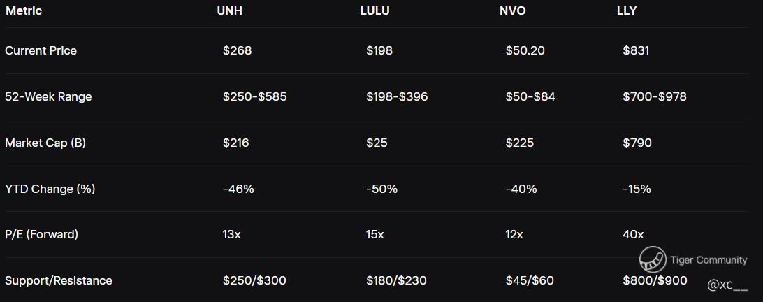 Buffett’s UNH bet at $314 (now $268) invites a buy, while LULU, NVO, and LLY offer dip plays if support holds.