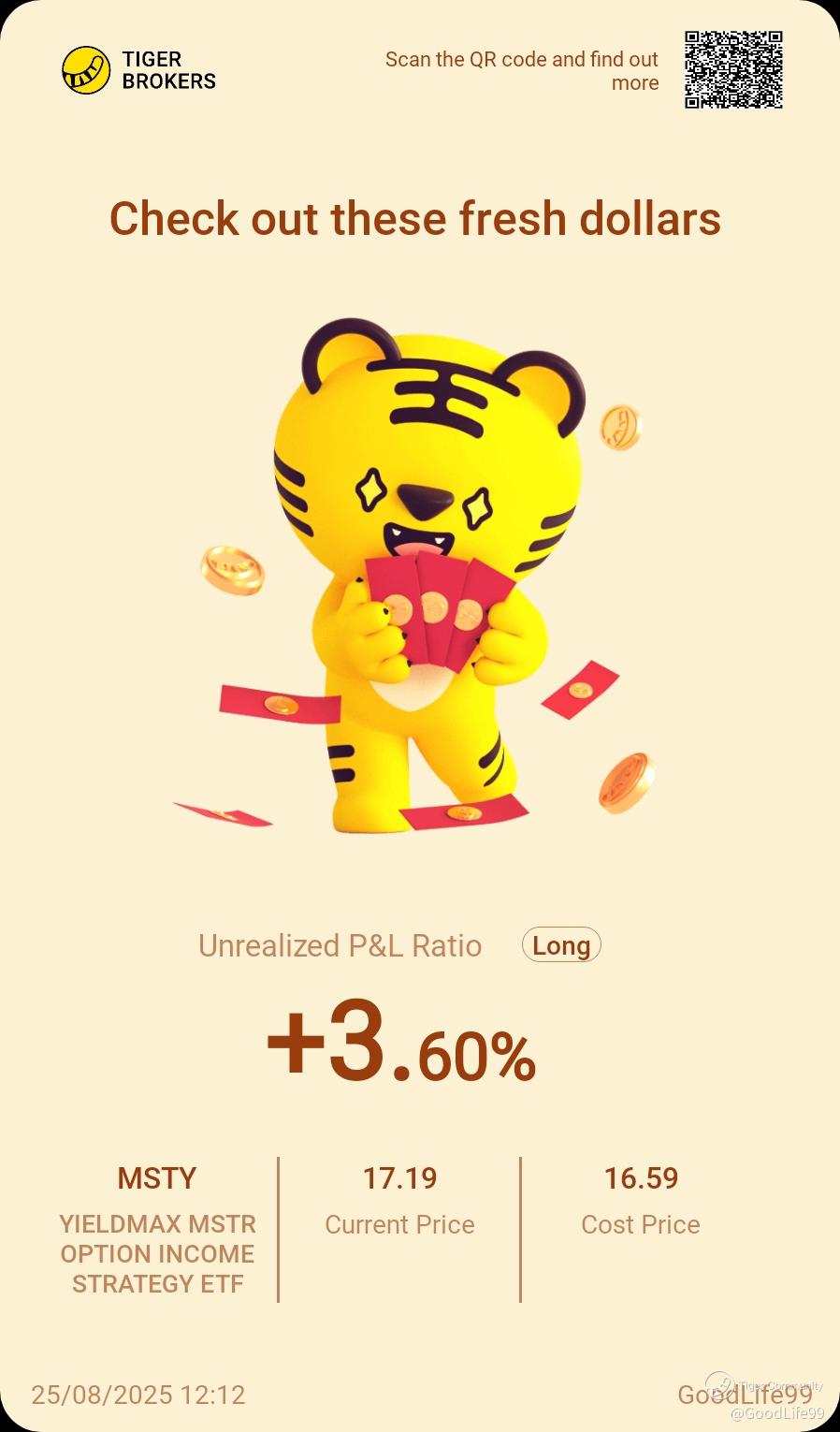 $YIELDMAX MSTR OPTION INCOME STRATEGY ETF(MSTY)$ Hooping on a high dividend [Allin] [Allin] [Allin] [Allin] stocks as part of the portfolio divesification! Hopefully able to DCA along the volatility.