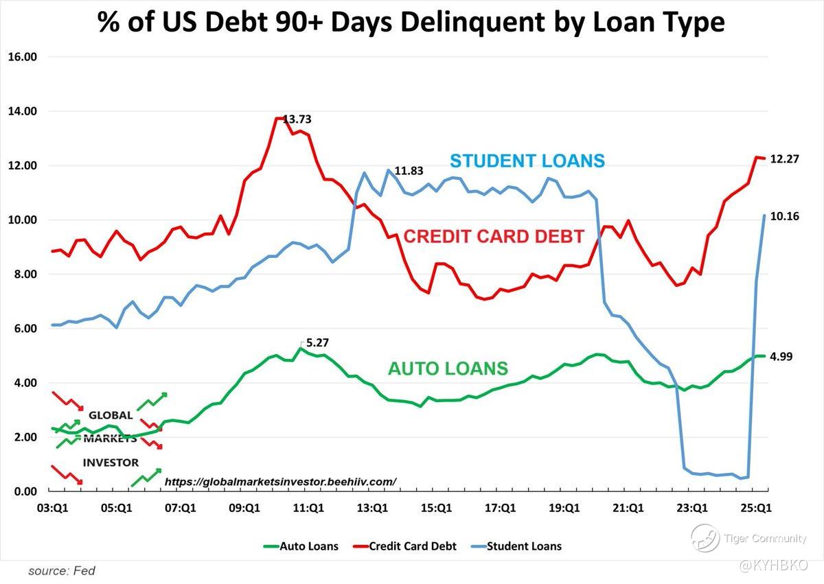 Delinquencies for high-income borrowers in the US are SURGING: Auto loan and credit card delinquencies (30+ days) from Americans making $150,000+ annually have risen nearly 20% in 2 years. This is faster than for middle- and lower-income borrowers. - X user Global Markets Investor