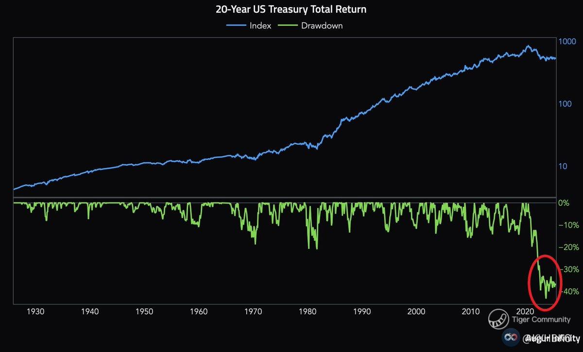 This is the worst BEAR MARKET in US Treasuries in modern history: The 20-year US Treasury drawdown has been ~38% since 2020, the largest in at least 100 years. Not even the 1970s or 1980s saw such a large decline, even when inflation was much higher. Public debt crisis? - X user Global Markets Investors