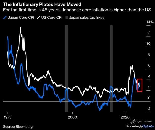 Japan’s Core CPI inflation is now ABOVE US Core CPI inflation for the first time in 48 years, excluding periods of sales tax hikes. Japan's Core CPI was 3.4% in July, one of the highest readings since the 1980s. By comparison, US core CPI inflation was 3.1%. Japan’s core inflation has now been above the Bank of Japan’s 2% target for 40 consecutive months. As a result, Japanese government bond yields keep rising, with the 30-year hitting 3.24%, the highest on record. Japan is in need of a major economic restructuring. - The Kobeissi Letter
