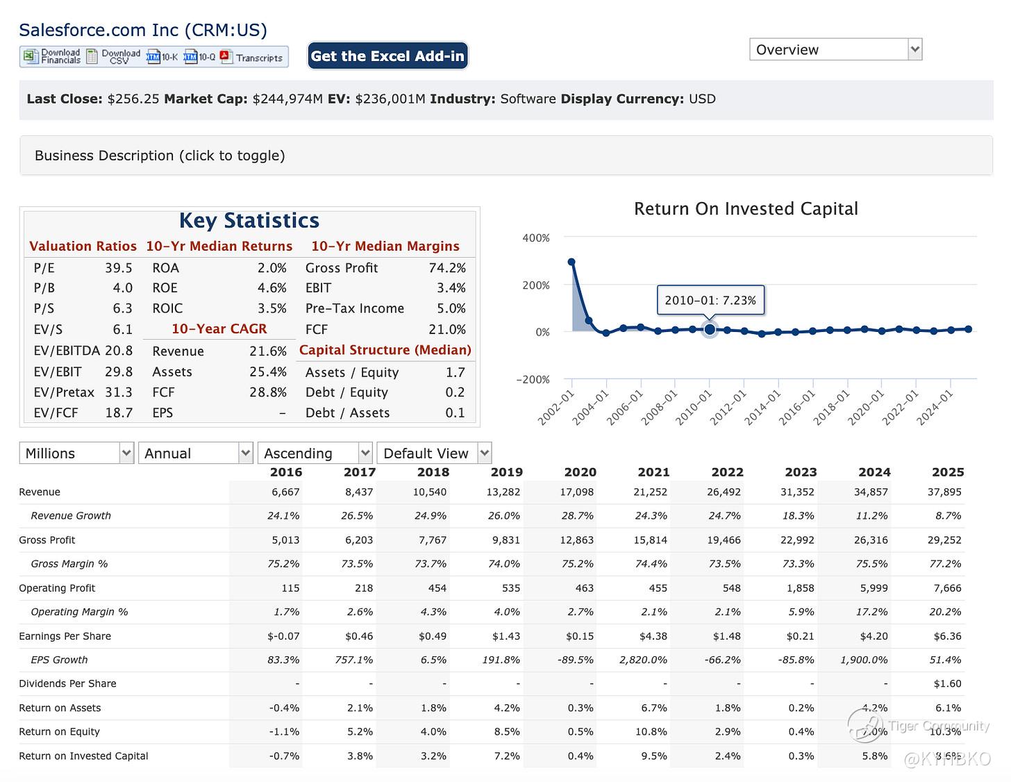 • Revenue: Salesforce’s revenue grew significantly from $6.6 billion in 2016 to $37.8 billion in fiscal 2025 (ended January 31, 2025), reflecting a 10-year compound annual growth rate (CAGR) of 21.6%.