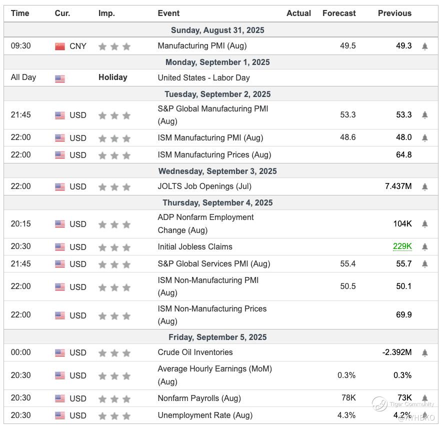 Economic Calendar: Key Market Movers (week of 01Sep25)