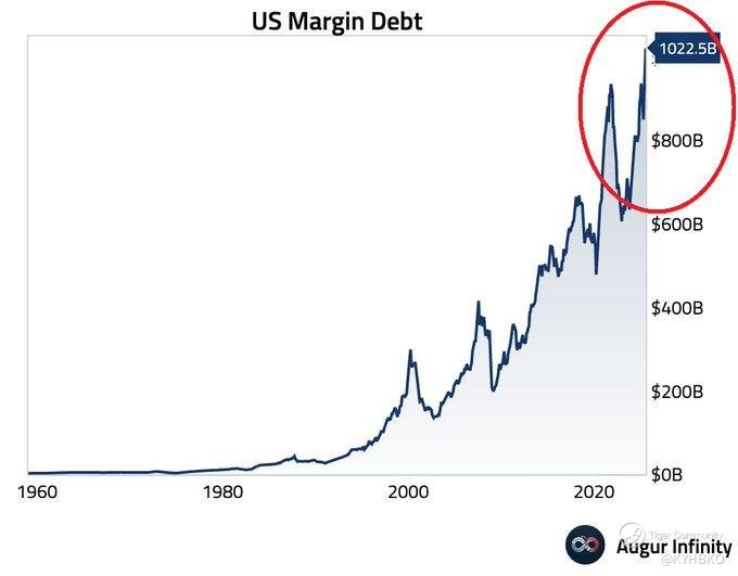 US margin debt jumped $14.6 billion last month to $1.02 TRILLION, the highest level EVER. Over the last 2 months, margin debt has SPIKED by more than $100BN As a share of US GDP, it is only below the 2021 frenzy.