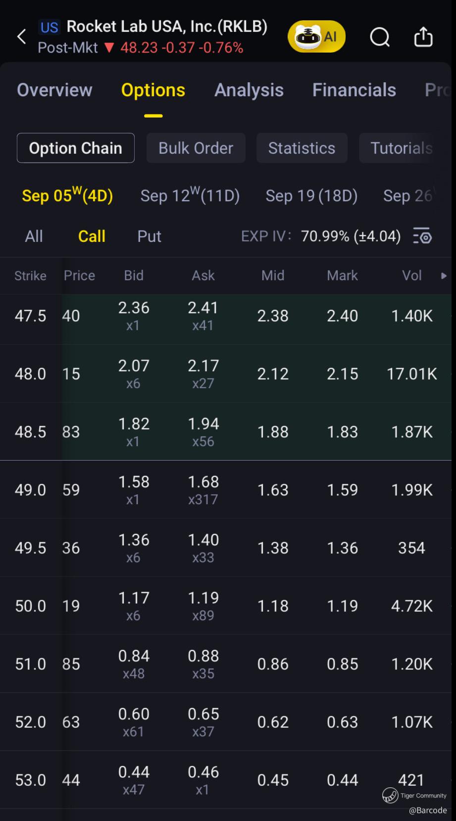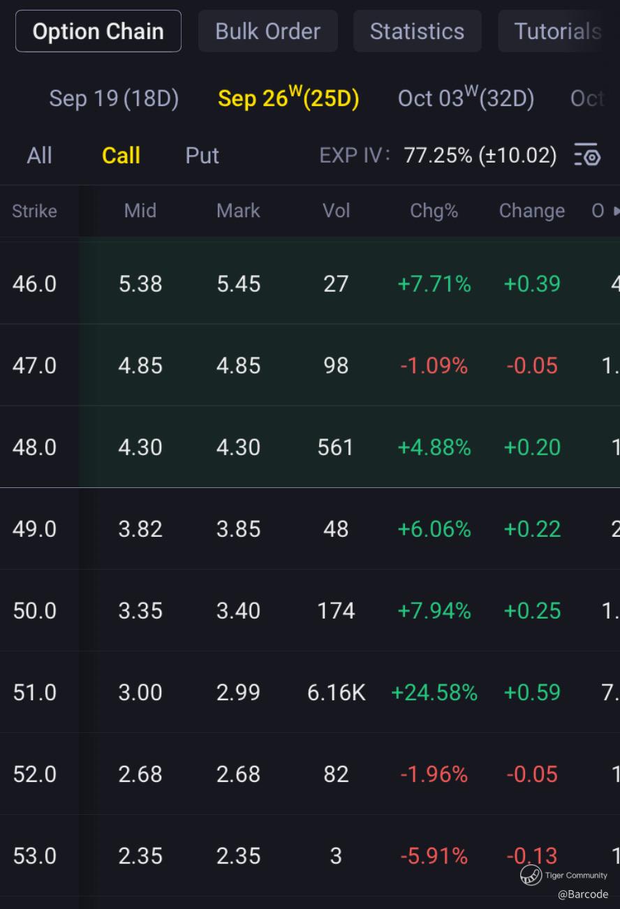 β’ Options: $48C volume 17K; $51C Sep 26W volume 6.16K (+24.6%).