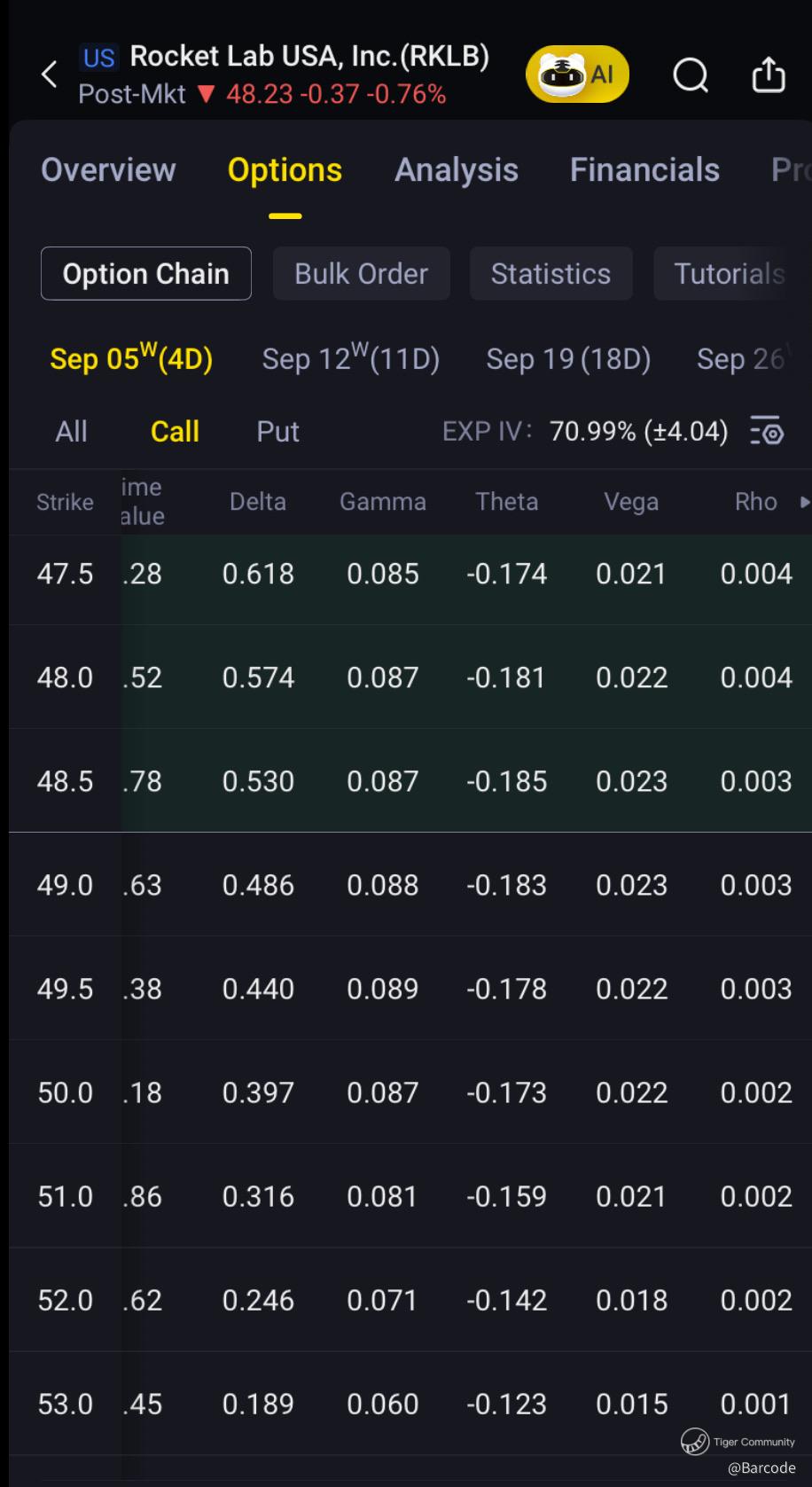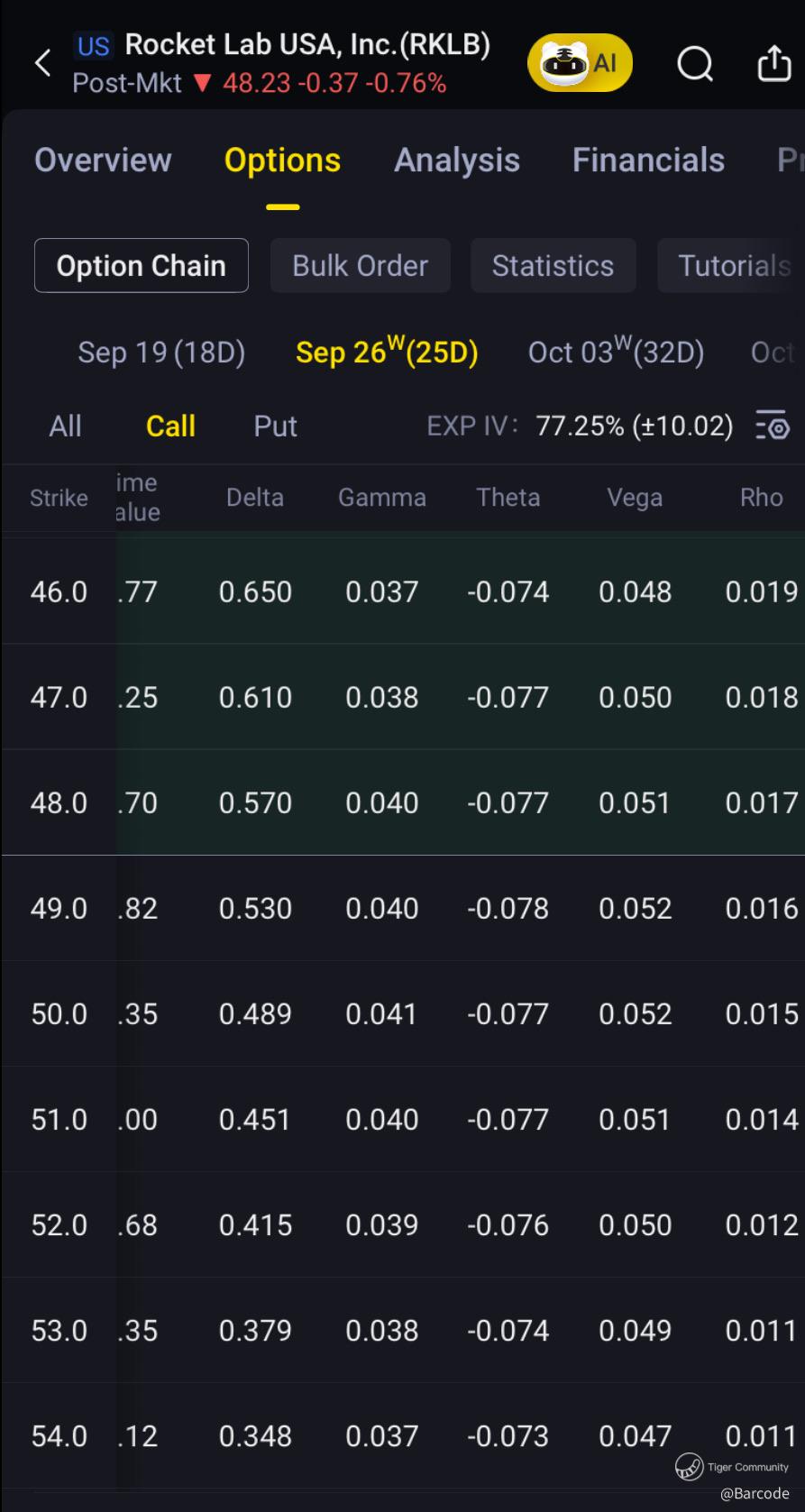 β’ $48C: 17.01K volume, mark $2.15, delta 0.574, gamma 0.087.