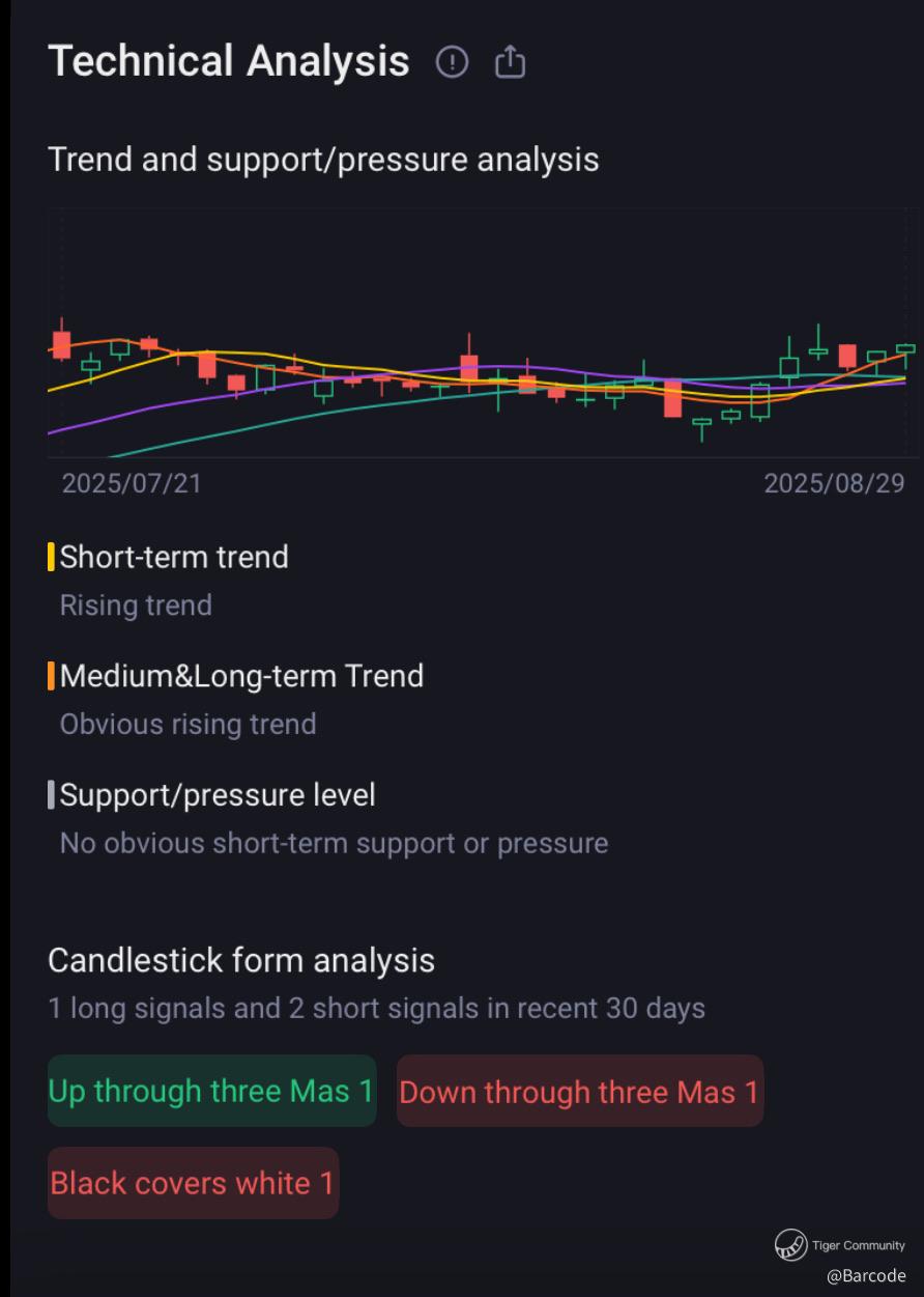 β’ Short-term candlestick analysis: 1 long and 2 short signals flagged (Up through three MAs = bullish; Black covers White = bearish caution).