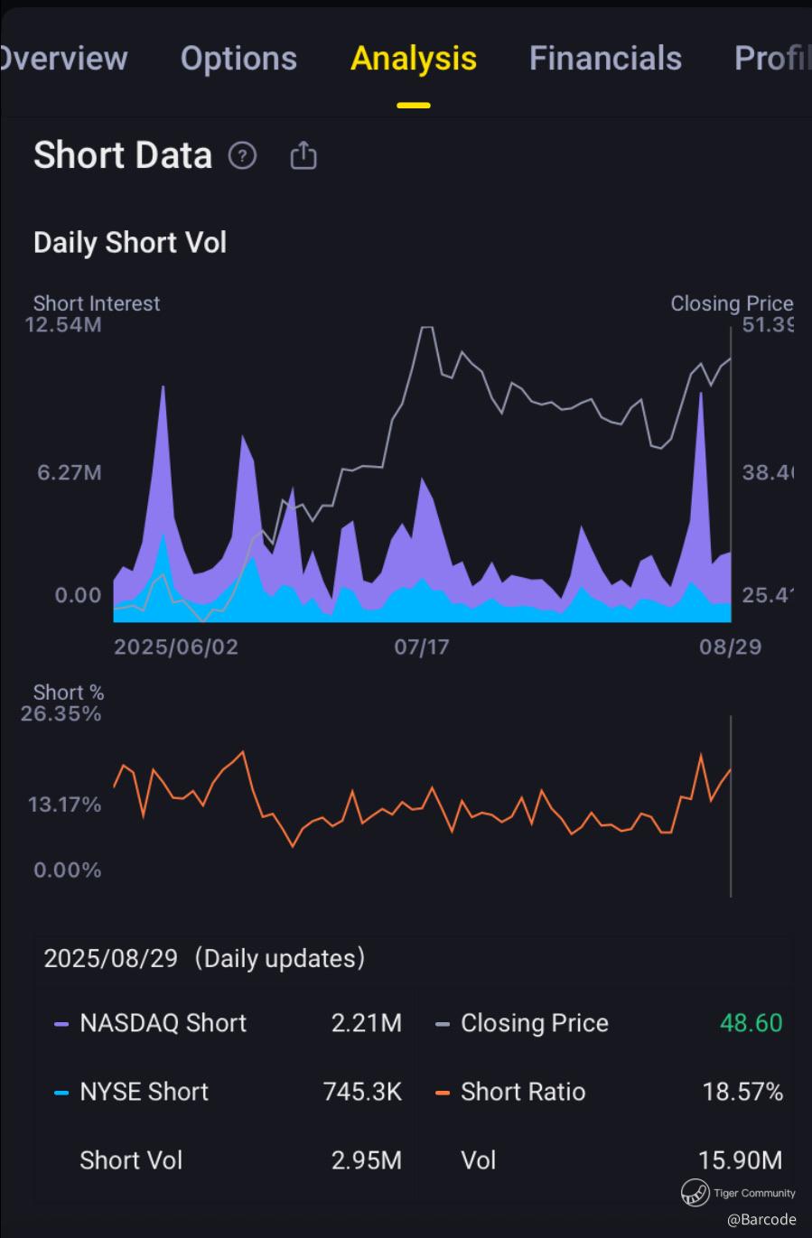 β’ Daily short vol (08/29): 2.95M vs total vol 15.9M (~19% of turnover).