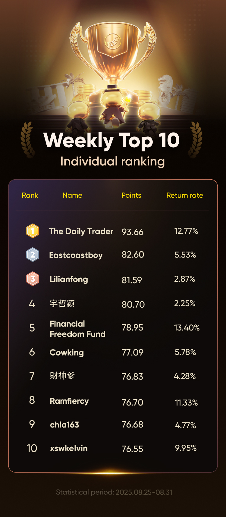 🚀 Aug 25—— Aug 29 Leaderboard: Top Traders & Market Highlights!
