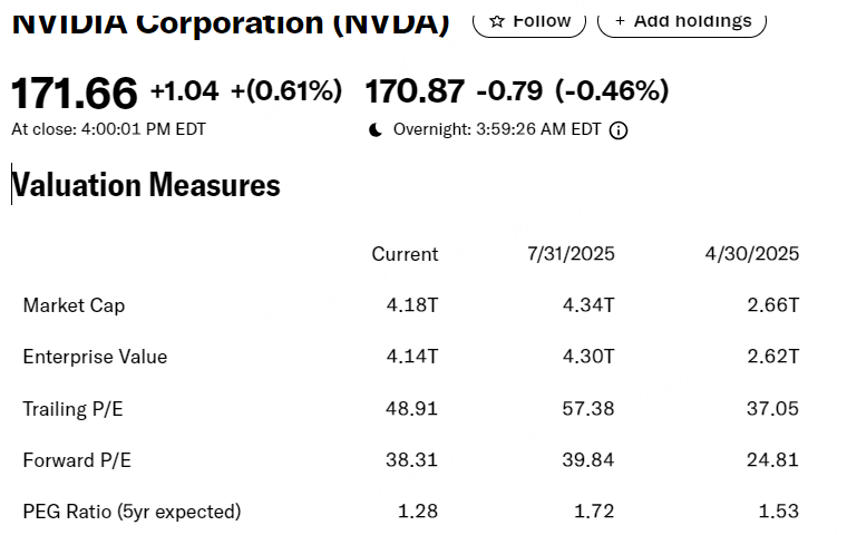 Right now, AVGO is up +12%. But Nvidia’s stock is falling below $170. NVIDIA’s PE & PEG are both at a reasonable level.