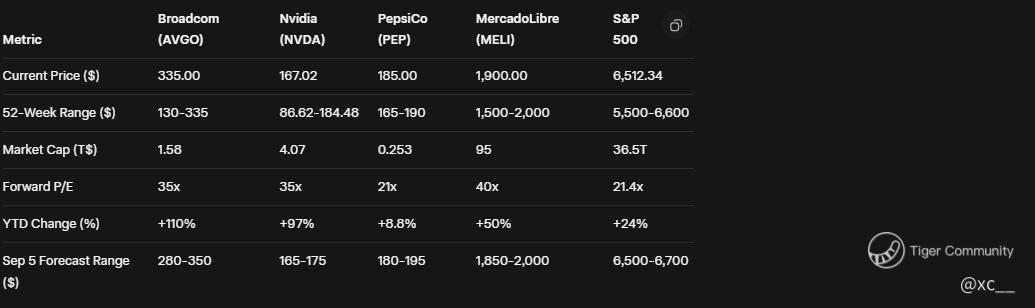 I’m taking a measured approach to the peak. I’ll trim 40% of my Broadcom at $335, targeting $290, with a $350 stop, locking 10% profit. I’ll hold 60% with a $280 stop, aiming for $330, betting on AI growth. I’ll buy Nvidia at $167, targeting $175, with a $160 stop, for a 5% gain if stable. For diversification, I’ll add PepsiCo at $185, targeting $195, with a $180 stop, and MercadoLibre at $1,900, targeting $2,000, with a $1,850 stop. I’m hedging with VIXY at $14, targeting $16, and holding 20% cash for a dip to $280 or tariff news. I’ll watch volume and Fed signals closely.