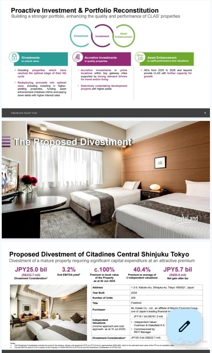 The proposed Japan assets divestment is dpu accretive. The divestment gains is about 50.8m. Not bad! The divestment amount of 222.7m. After deducting all expenses, net proceeds of 187.4m. So much $ to pay for admin and expenses .