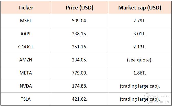 Below is the recent price and market cap of the Mag 7 at time of this writing.