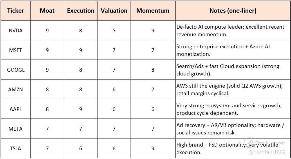 Quick interpretation: NVDA, MSFT, GOOGL lead on moat; NVDA + GOOGL + MSFT show the strongest momentum/execution mix today.