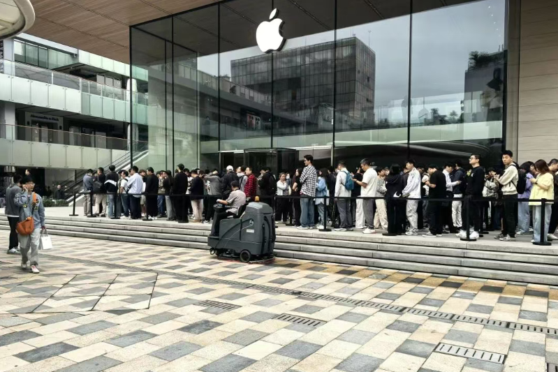 At $Apple(AAPL)$ Beijing Sanlitun store, long lines had already formed early in the morning. By 9 a.m.—nearly an hour after opening—the queue was still just as long.