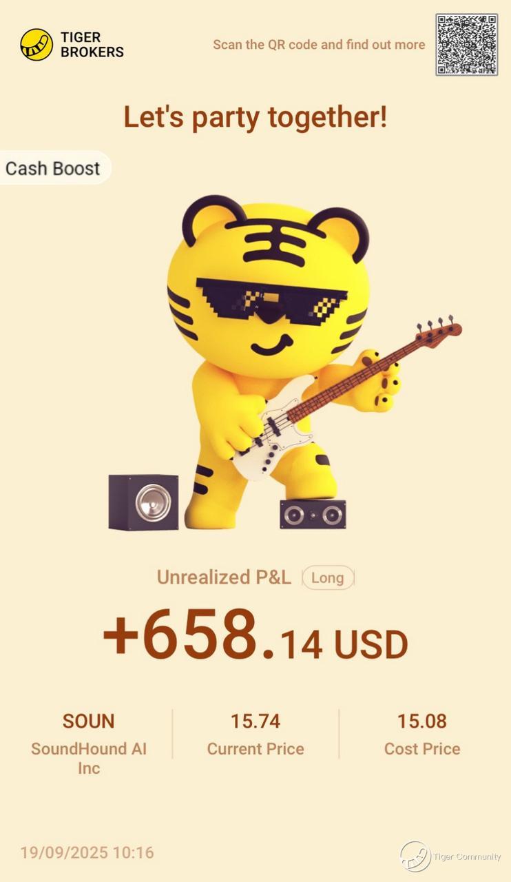 $SoundHound AI Inc(SOUN)$ No problem flexing my holdings — healthy and sunny! Enjoyed two days of rate cut dividends, full of momentum! Aiming to hold firmly at $16, new highs next week!