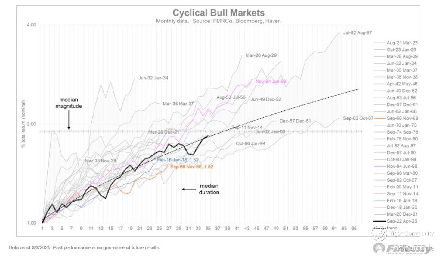 Since the April 8 low, the $SPX has surged +33%, beating the post-correction historical average of +27%. According to Fidelity’s latest Cyclical Bull Market chart, we’re tracking ahead of both median duration and magnitude, sitting firmly in the upper quartile of historical recoveries alongside 1982, 1995, and 2009.