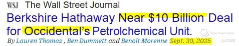On Tue, 30 Sep 2025, it was reported by WSJ that $Berkshire Hathaway(BRK.B)$ will be acquiring $Occidental(OXY)$ Petrochmical unit OxyChem, for nearly $10 billion. (see below)