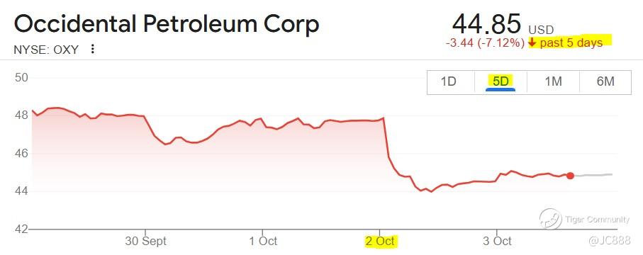 The surprise on 02 Oct 2025 (after OxyChem sale was confirmed), parent-stock OXY fell by -7%. (see below)